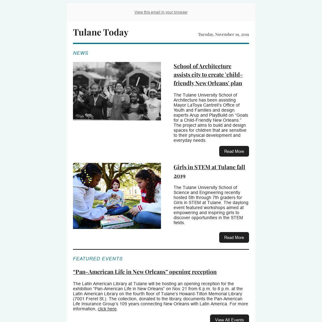 Tulane Today accepts, for consideration, news and event submissions that are of interest to the Tulane community. Items must be 80 words or less and contain contact information and a web link that will be included in the published announcement.