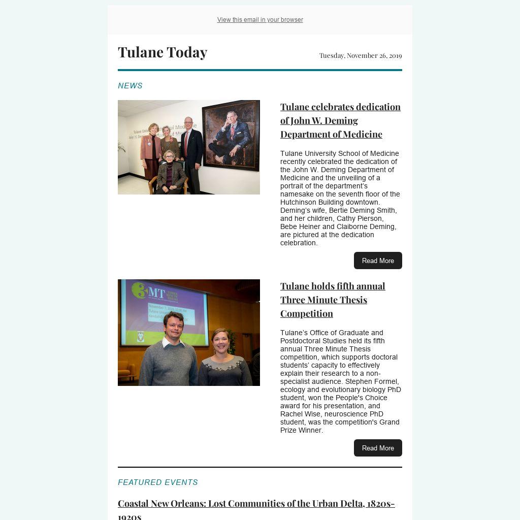 Tulane’s Office of Graduate and Postdoctoral Studies held its fifth annual Three Minute Thesis competition, which supports doctoral students’ capacity to effectively explain their research to a non-specialist audience. Stephen Formel, ecology and evolutionary biology PhD student, won the People's Choice award for his presentation, and Rachel Wise, neuroscience PhD student, was the competition's Grand Prize Winner.