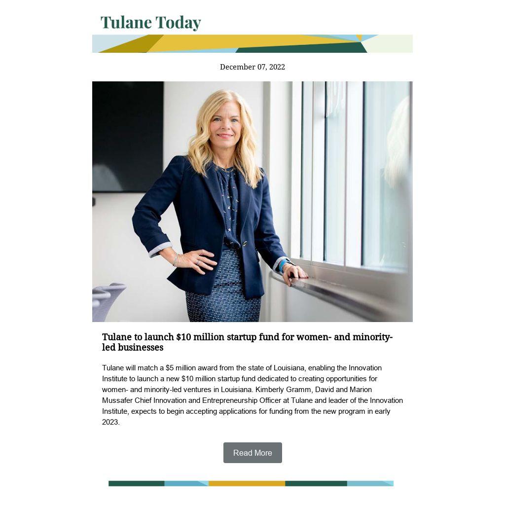 Tulane will match a $5 million award from the state of Louisiana, enabling the Innovation Institute to launch a new $10 million startup fund dedicated to creating opportunities for women- and minority-led ventures in Louisiana. Kimberly Gramm, David and Marion Mussafer Chief Innovation and Entrepreneurship Officer at Tulane and leader of the Innovation Institute, expects to begin accepting applications for funding from the new program in early 2023.