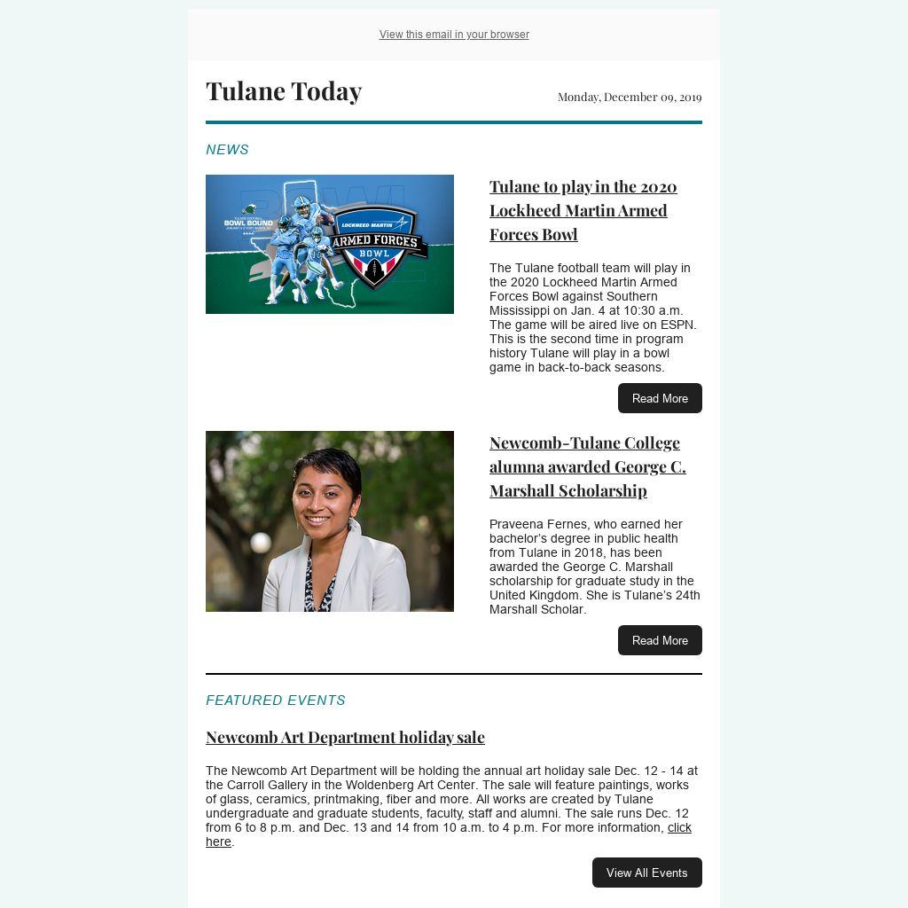 The Tulane football team will play in the 2020 Lockheed Martin Armed Forces Bowl against Southern Mississippi on Jan. 4 at 10:30 a.m. The game will be aired live on ESPN. This is the second time in program history Tulane will play in a bowl game in back-to-back seasons.