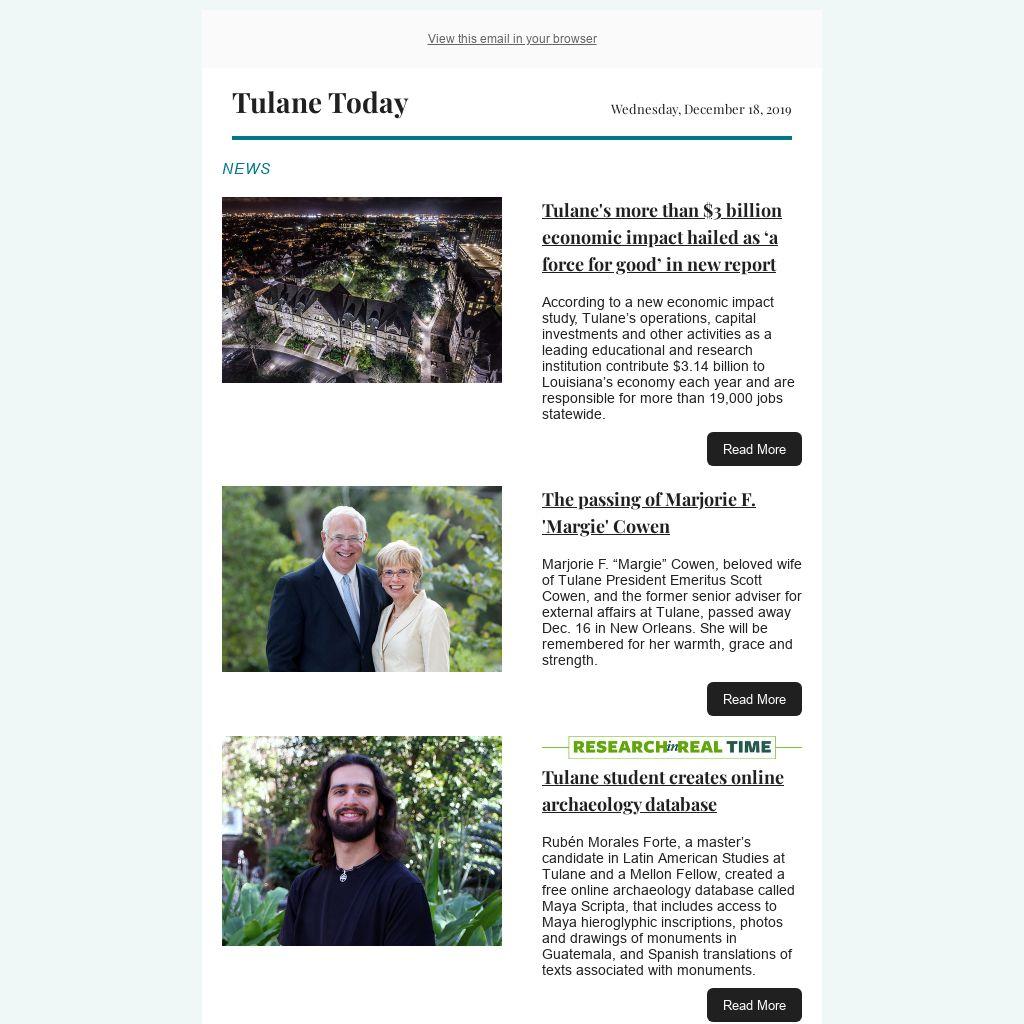 Tulane Today accepts, for consideration, news and event submissions that are of interest to the Tulane community. Items must be 80 words or less and contain contact information and a web link that will be included in the published announcement.