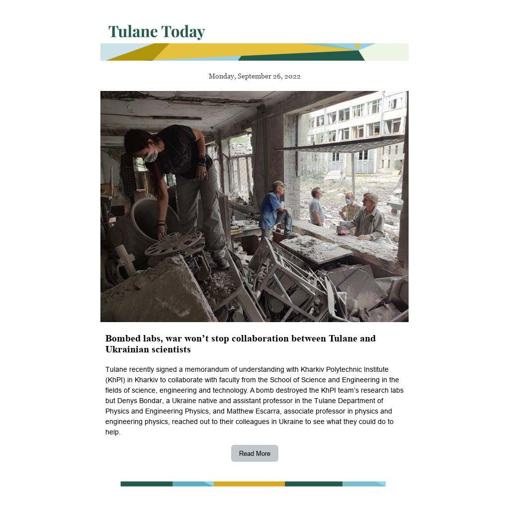 Tulane recently signed a memorandum of understanding with Kharkiv Polytechnic Institute (KhPI) in Kharkiv to collaborate with faculty from the School of Science and Engineering in the fields of science, engineering and technology. A bomb destroyed the KhPI team’s research labs but Denys Bondar, a Ukraine native and assistant professor in the Tulane Department of Physics and Engineering Physics, and Matthew Escarra, associate professor in physics and engineering physics, reached out to their colleagues in Ukraine to see what they could do to help.