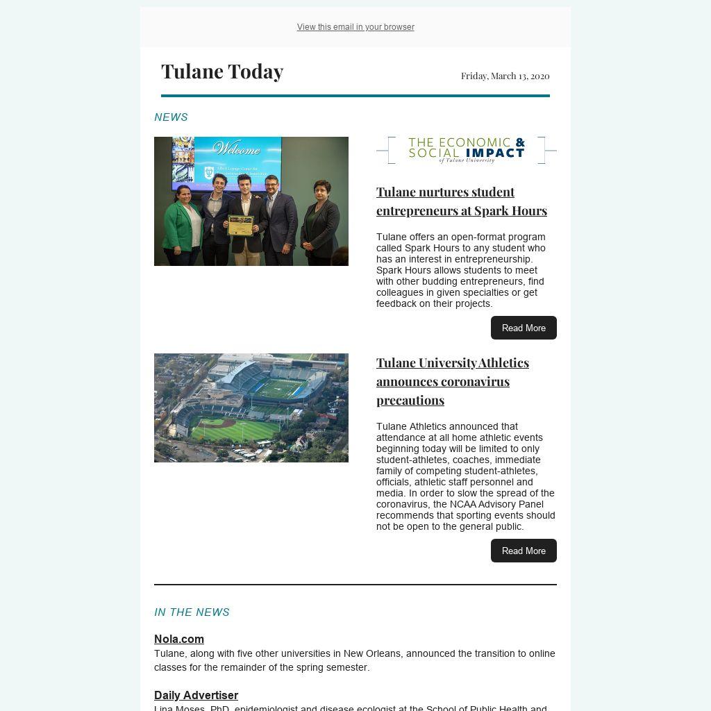 Tulane Today accepts, for consideration, news and event submissions that are of interest to the Tulane community. Items must be 80 words or less and contain contact information and a web link that will be included in the published announcement.